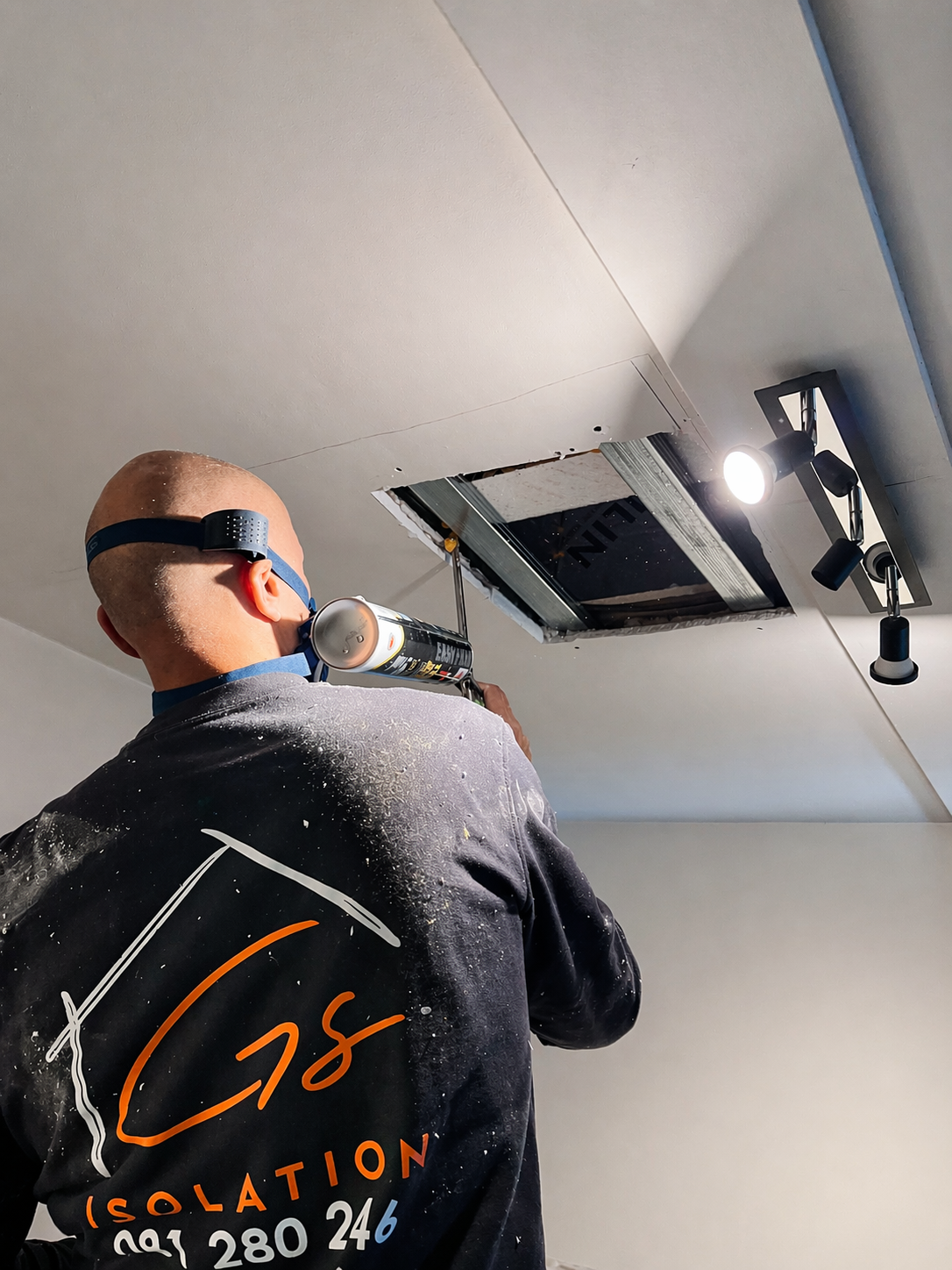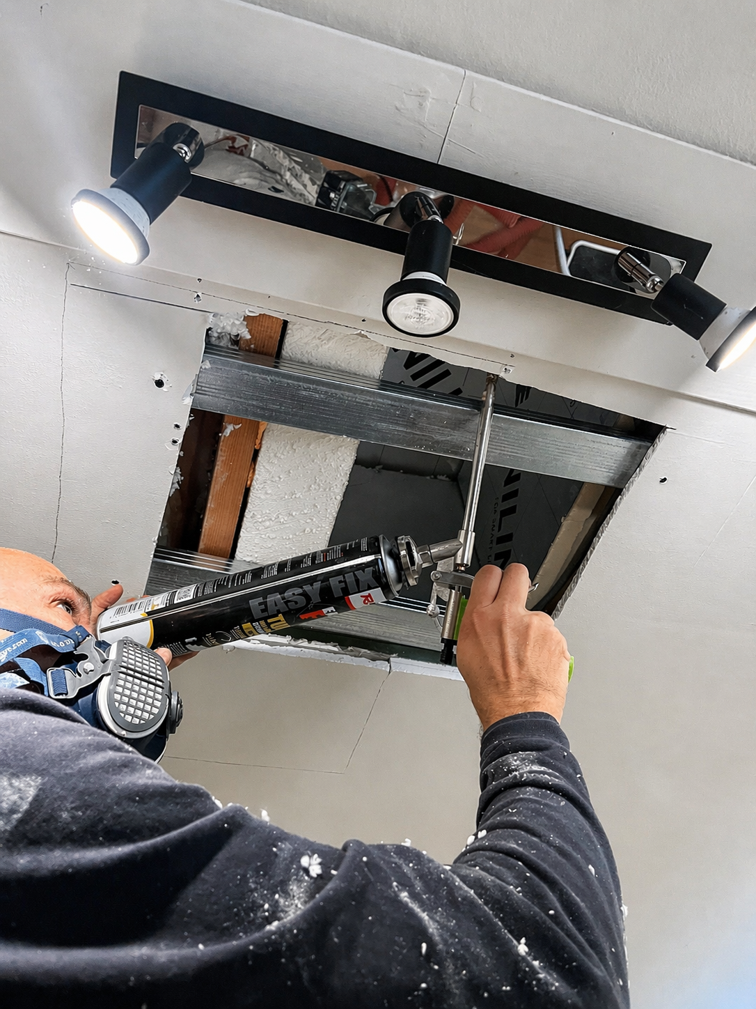 Après intervention, l’ouverture a été soigneusement refermée avec la pose d’une nouvelle plaque de gyproc, enduite en deux couches pour une finition propre. Il ne restait plus au client qu’un léger ponçage et une mise en peinture pour retrouver un plafond impeccable.